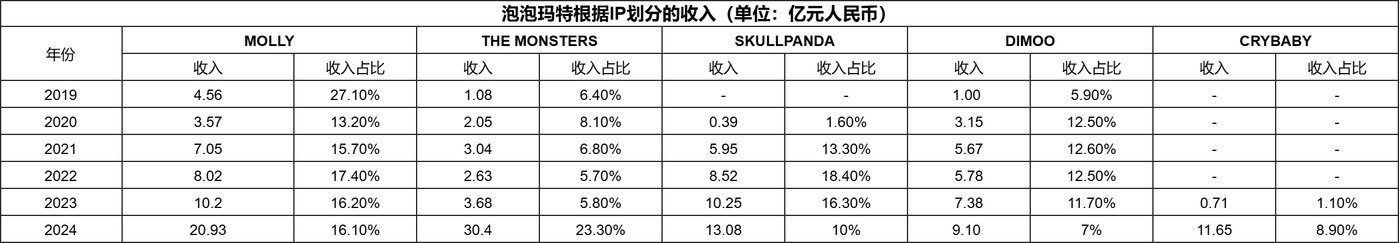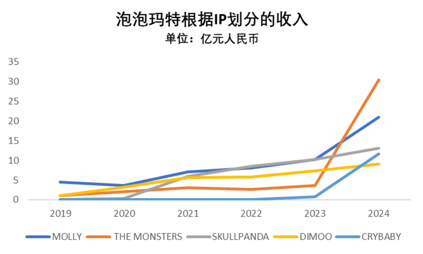 2024年,泡泡玛特实现营收130.4亿元,较2023年的63.01亿元增长106.9%。其中,The Monster系列IP的收入同比增长726.6%,突破30亿元,成为泡泡玛特历史上首个30亿级IP。紧随其后的MOLLY以20.9亿元位居第二。