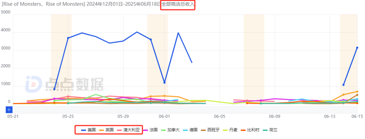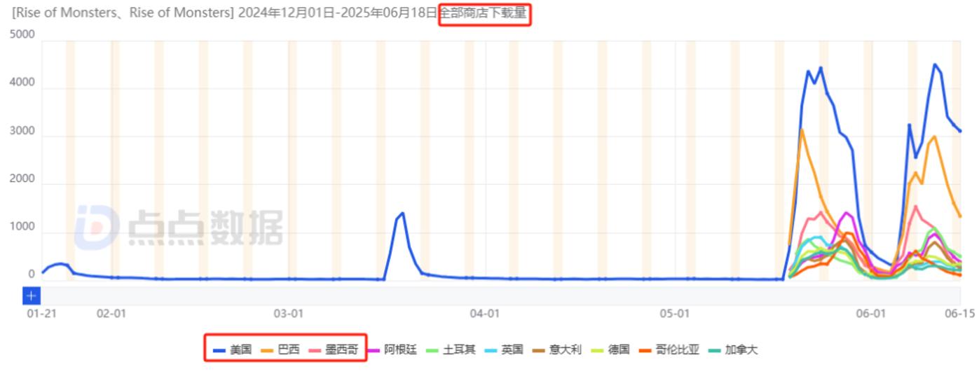 《Rise of Monsters》目前累计下载量在24万左右,美国、巴西以23.51%、10.56%的占比位列前两位,总流水预估超70万,美国占比为47.98%,英国和澳大利亚紧随其后。