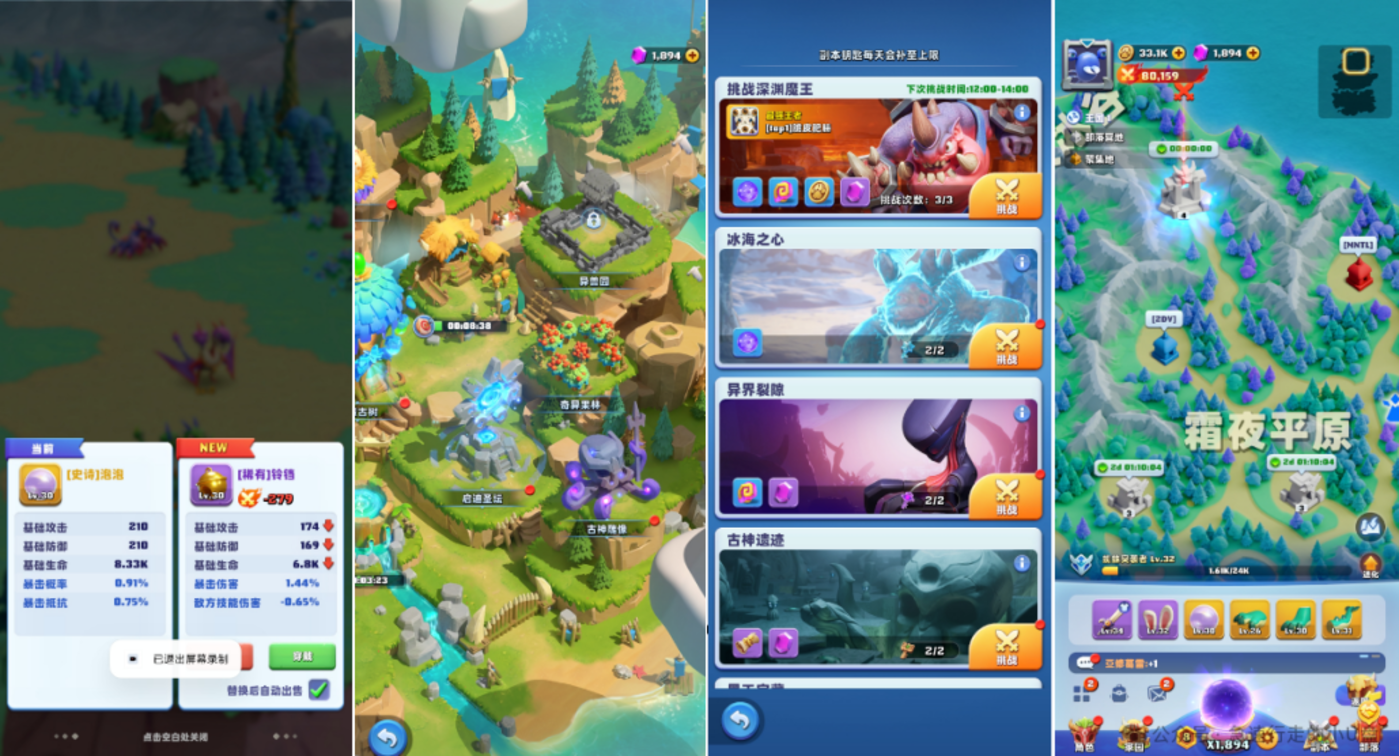 然后是今年1月中下旬上线的《Rise of Monsters》,这款游戏无论是icon、商店图、孢子题材亦或是游戏内美术素材都与上面提到的《War of Evolution》高度类似,但在玩法上,该作采用“开箱子+RPG+SLG”的框架与前作存在明显差异。