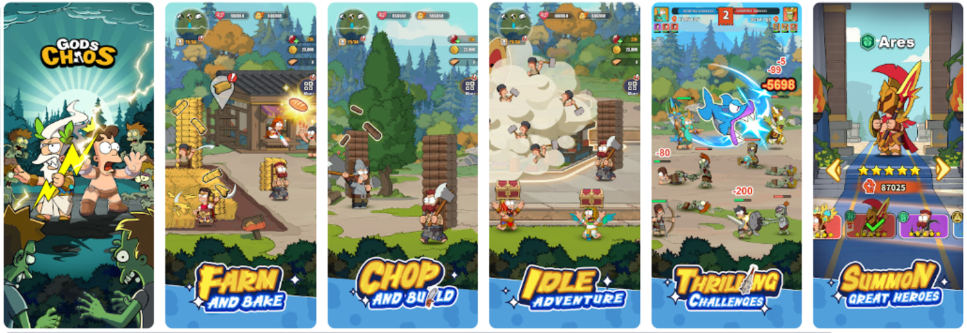 国内小游戏的风潮,ONEMT同样没有放过,《Gods Chaos》便是其推出的一款“指尖Like”产品,采用《辛普森家族》的美式漫画风格,具体玩法则是横向的订单系统解锁地块与放置卡牌推图。