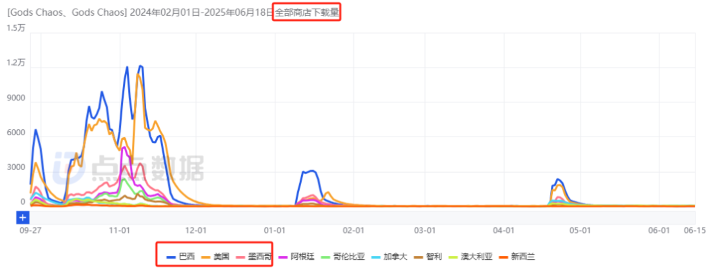 截止目前,游戏累计下载量约为100万,其中巴西与美国分别占比37.33%、32.07%,总流水达390万元,美国占比高达80.1%,还没有看到《Gods Chaos》明显的扩量预兆,未来表现需要持续关注。