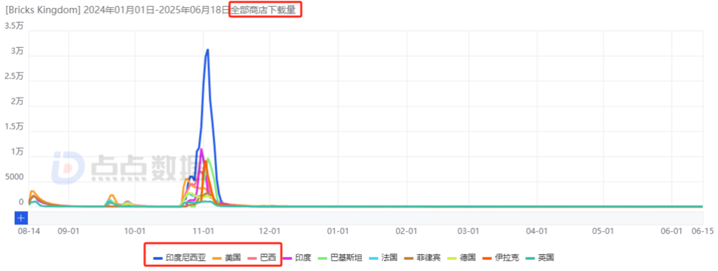 《Bricks Kingdom》最早于2024年8月中旬登陆美国、菲律宾、印度、英国的Google Play进行小规模测试,彼时其日下载量最高不超过1万,日流水最高不超过2万。10月中下旬开始,游戏逐步登陆全球大部分国家及地区,投放力度也开始逐步拉升,11月初时日下载量来到了近10万的峰值,日流水最高也来到了11万左右,然而此后数据一路下滑,当前其日下载不足2000,日流水更是难以统计。