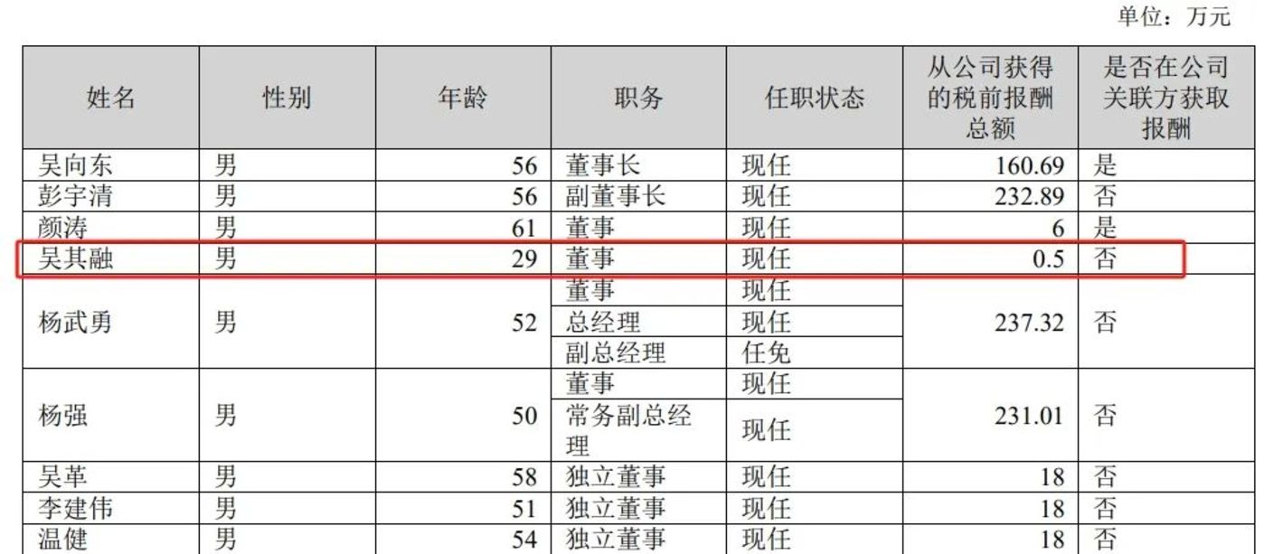 2024年10月,公司原总经理李伟离任,由副总经理杨武勇接任。同时,创始人吴向东之子吴其融进入董事会担任非独立董事。这位“酒二代”出生于1996年,毕业于英国伯明翰大学,工学学士。在此之前,他已介入多项家族生意。