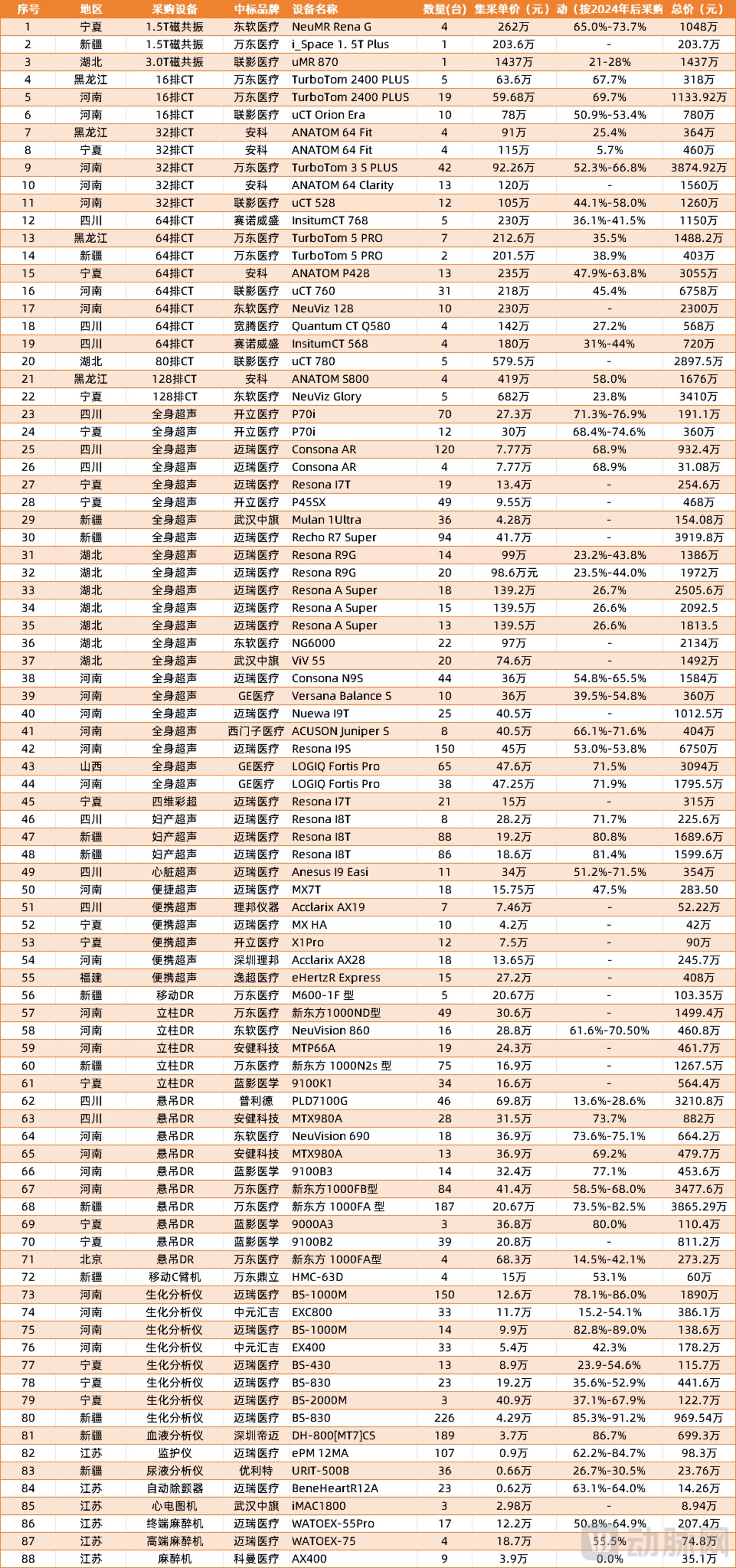这波集采降价不分品牌、种类、品次,中低端降幅尤为惨烈。以县域医共体设备更新为例,200万一台的1.5T磁共振,100万一台的64排CT,不到50万一台的全身超声,将医疗设备的价格拉低到了一个过往难以想象的价格。