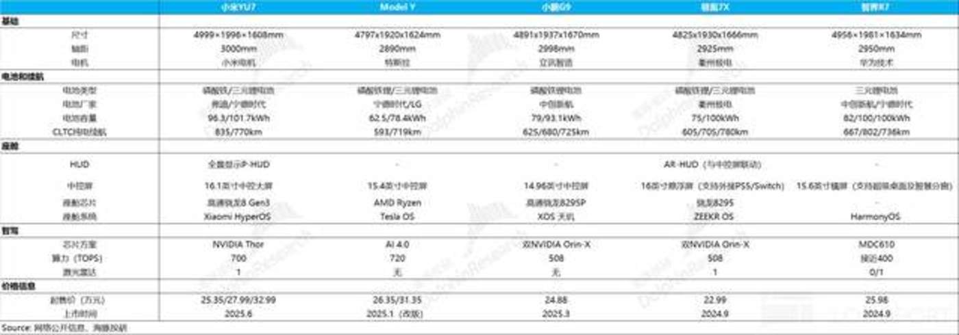 将小米 YU7 与主要竞争对手进行对比:①小米 YU7 的电池容量高于同行竞品,具有明显的续航优势;②小米 YU7 全产品配备全景显示 P-HUD;③智驾方面,小米 YU7 采用英伟达 Thor 芯片,算力接近于新版 Model Y,领先于其他竞品。小米 YU7 比 Model Y 多搭载了 1 颗激光雷达。