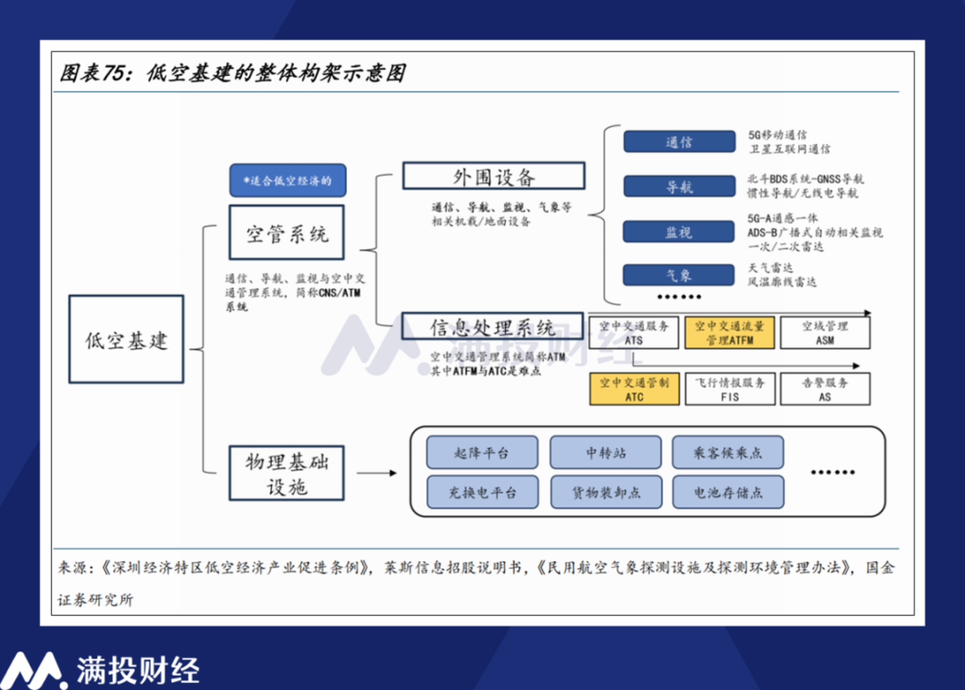 就基建领域来看,低空经济的基建设施可以分为两个方向,即“硬件”与“软件”两端。硬件代指相关飞行器的地面基础设施,包括适用于低空飞行器的通用机场,以及无人机的起降/充能场地,保障低空安全的导向设备、监视设备等。而软件则代指系统领域的相关新型基建,包括空管系统、雷达、通信网络、空域管理等。“硬件”与“软件”均是低空经济运行的基础,也是当前阶段投入最大,最为耗时的环节。