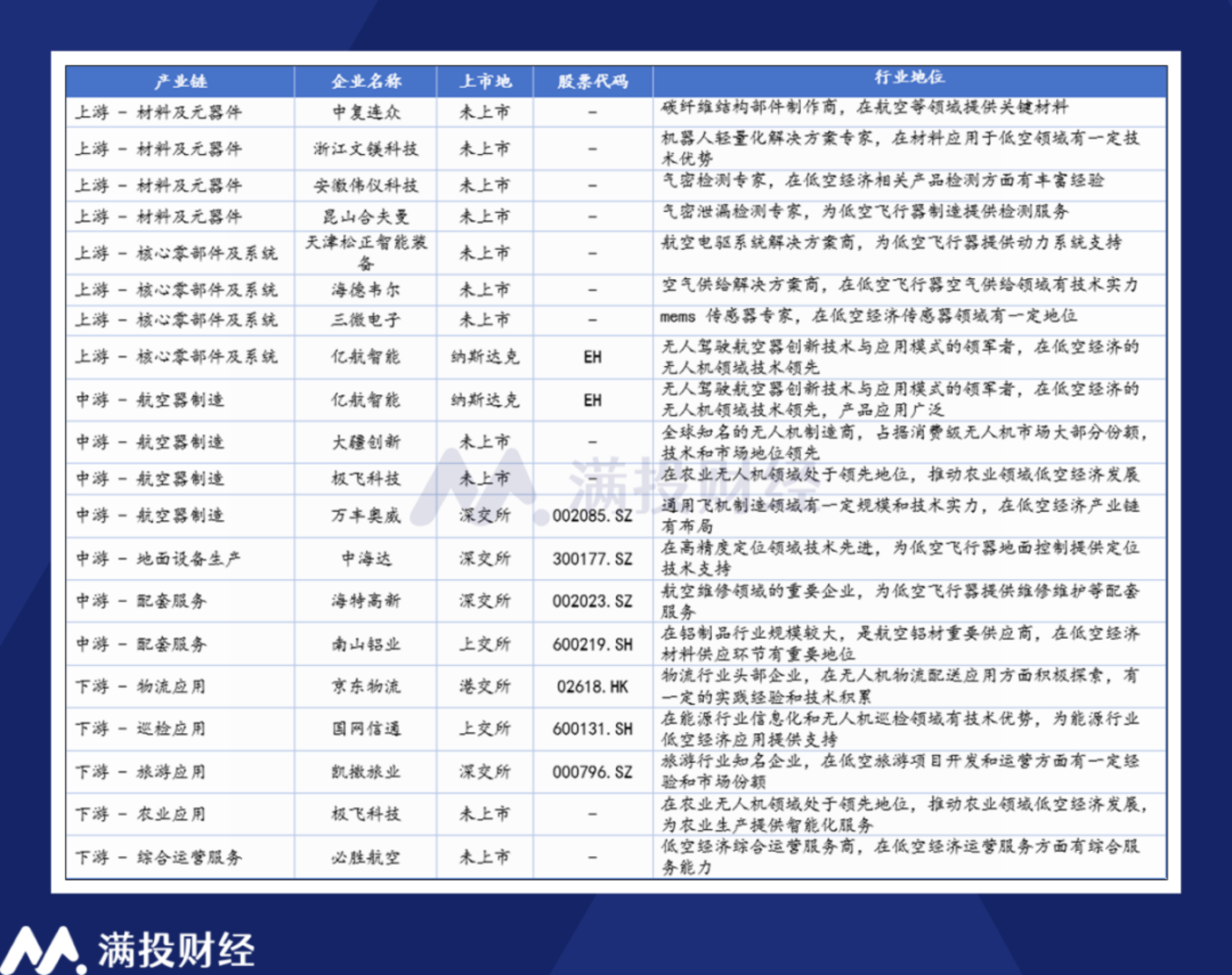 具体到相关企业方面,在行业趋势下,国内有许多企业深耕低空经济领域,其中也不乏在A股、港股上市的企业,其业务的侧重点存在一定趋同、凸显出行业目前仍处于激烈竞争的时期,但同样存在聚焦特定赛道,并取得了不错成就的企业。投资者可参考下表,寻找适宜的投资标的。