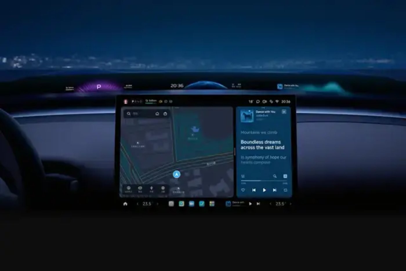 内部使用了长达1.1m的天际屏全景显示,可显示仪表、多媒体、时钟天气、地图导航等5类信息;仪表台的体积大幅缩小,配有两个80W的无线充电板,两个普通螺口也创新成了带有27W供电功能;全车还有9处隐藏式磁吸点位,可收纳纸巾盒等日常用品。