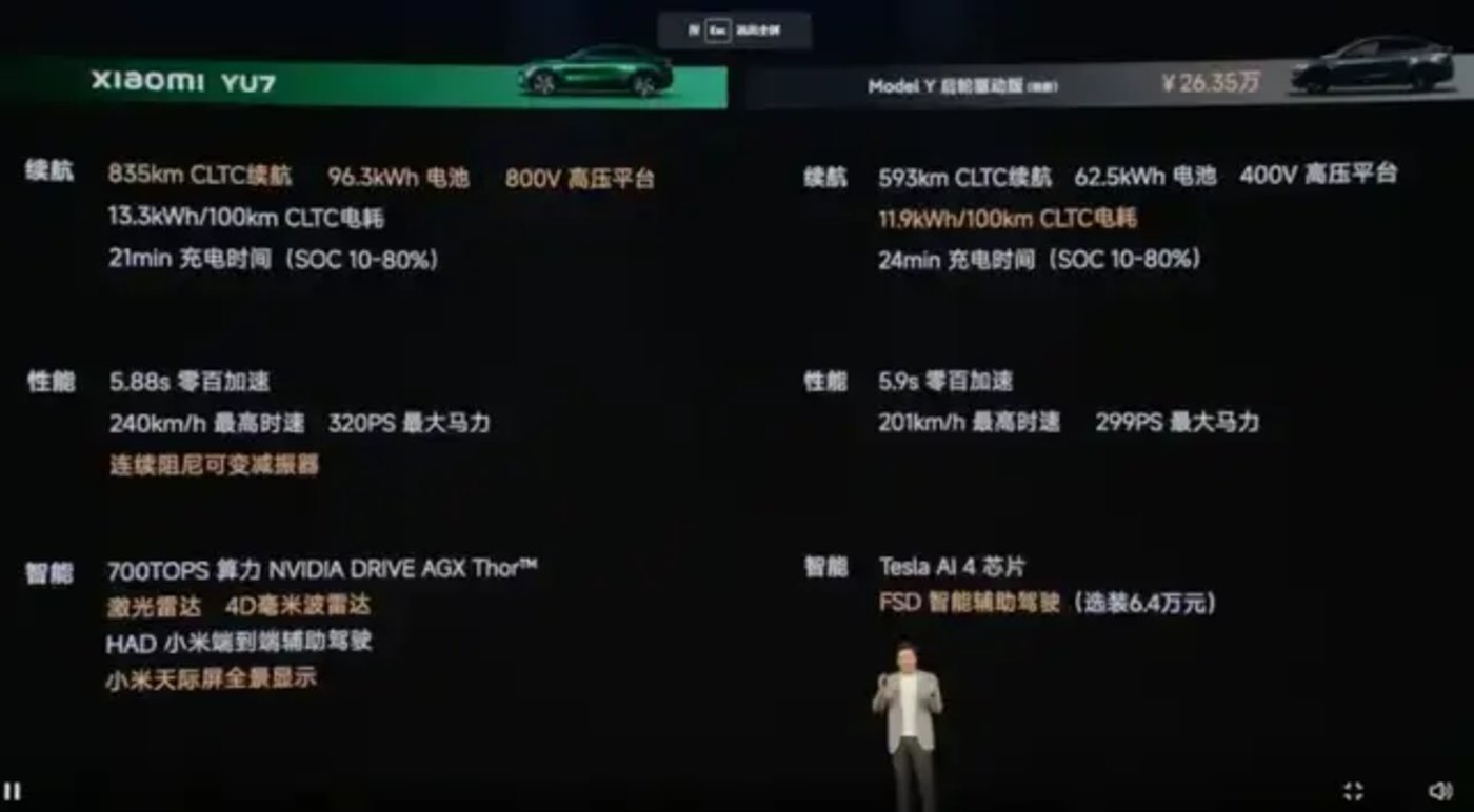 在现场发布中,雷军着重对比了YU7和特斯拉旗舰款SUV Model Y的区别: