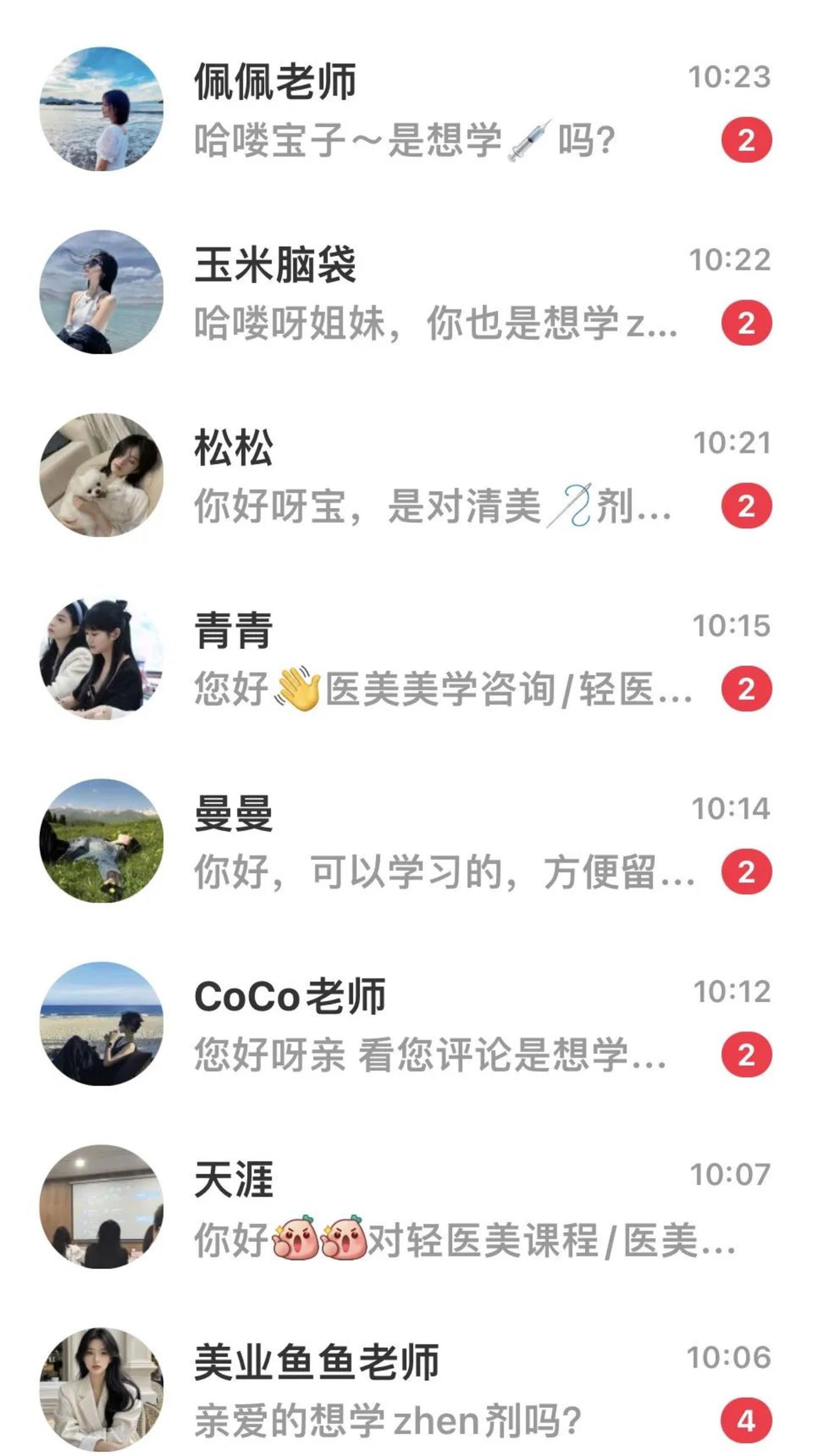 一直对各类医美很感兴趣的小葵(化名),在小红书一篇笔记下表达了自己想学微整类课程后,私信里瞬间涌入了10余个介绍相关课程的从业者,分别来自广州、上海等地的不同非法培训机构。