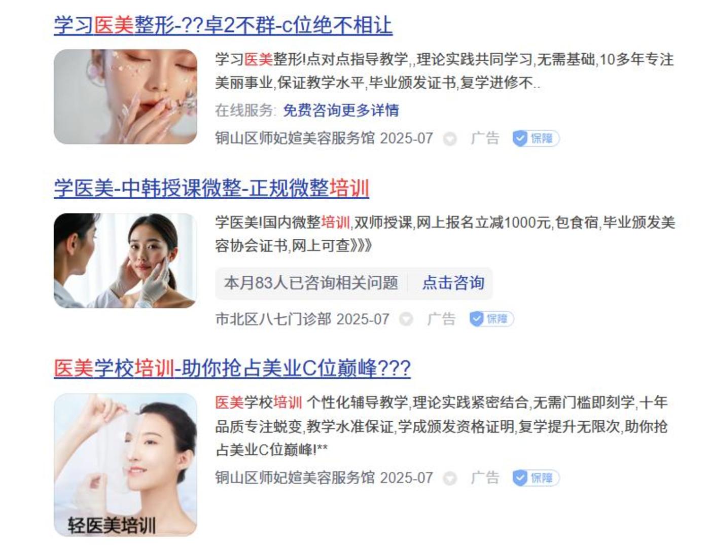 在搜索引擎或社媒平台上,只要搜索“医美 学习”相关字眼,就会跳出五花八门的美业培训机构的广告,其中既有生活美容,也有医疗美容,也包括纹眉等纹绣类课程。