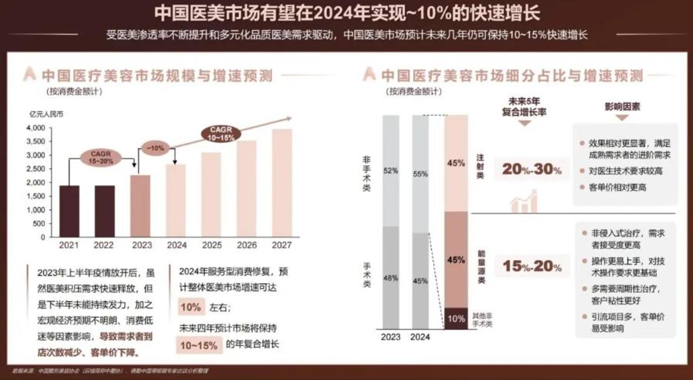 中国整形美容协会发布的《中国医美行业2024年度洞悉报告》显示,受医美渗透率不断提升和多元化品质医美需求驱动,中国医美市场预计在未来几年内仍可保持10%至15%的快速增长;其中,注射类医美治疗因其效果相对更显著,预计在未来五年内保持20%至30%的复合增长率。