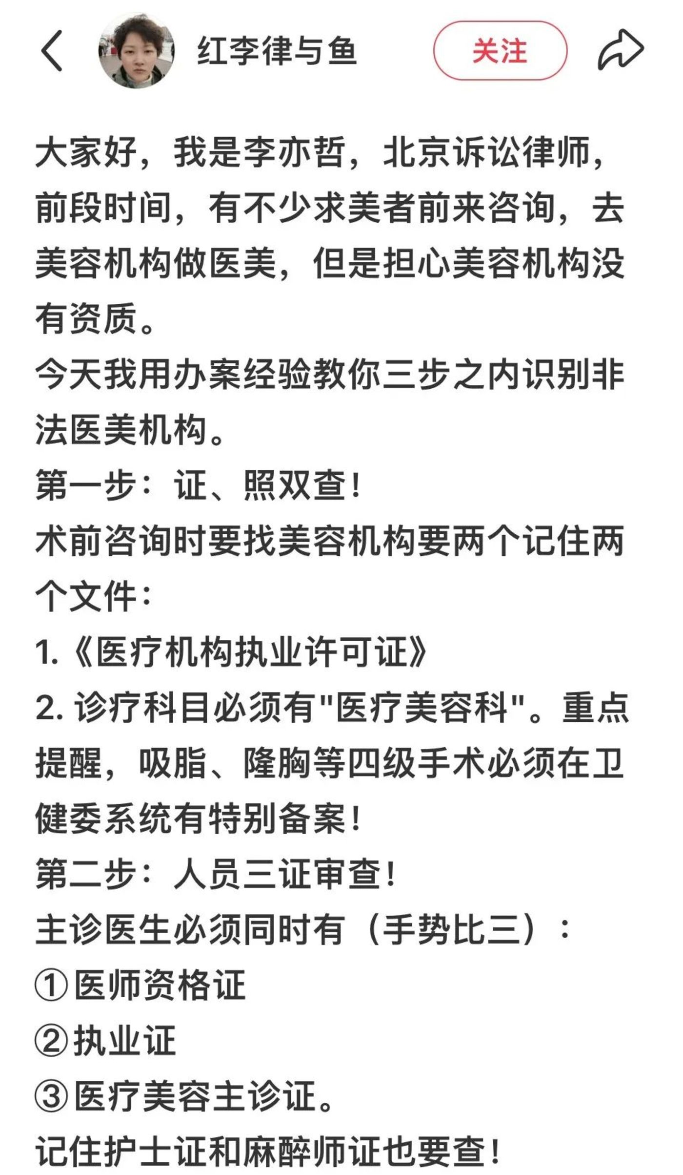 还有律师提到,普通消费者想要“避坑”,可以在术前咨询时找美容机构和主诊医生索要证件,并仔细检查美容机构在你身上使用的药品,肉毒素、玻尿酸包装必须带“国药准字”,遇到外文包装可以要求出示海关证明和检验报告。