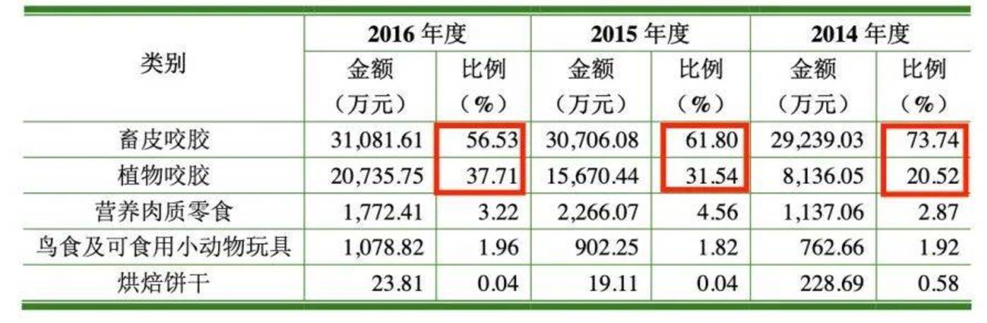 因此,在佩蒂股份的诸多产品中,狗咬胶始终在总营收中占据大头。其招股书显示,2014年-2016年,畜皮咬胶和植物咬胶合计在总营收中占比超过了90%。