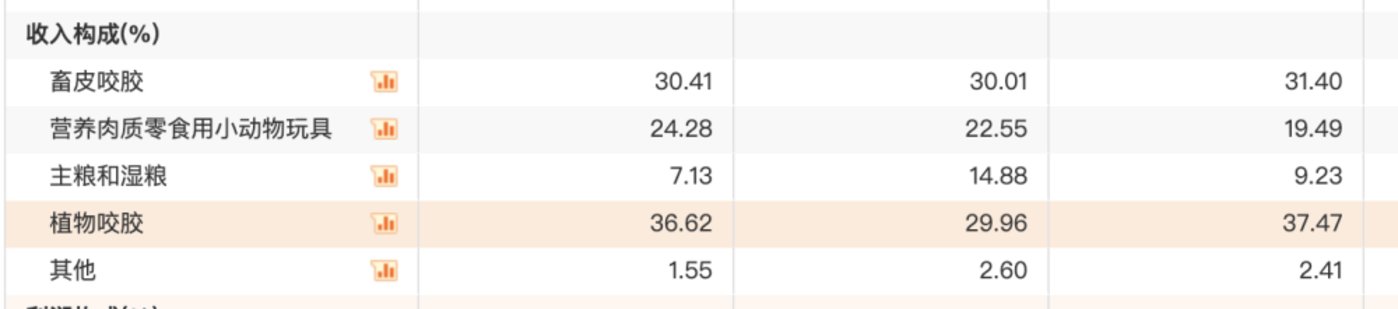 乖宝股份2013年开始布局国内业务时便押注了主粮市场,中宠股份的主粮战略则在2017年就被明确提了出来。更早上市的佩蒂股份被二者甩在身后。