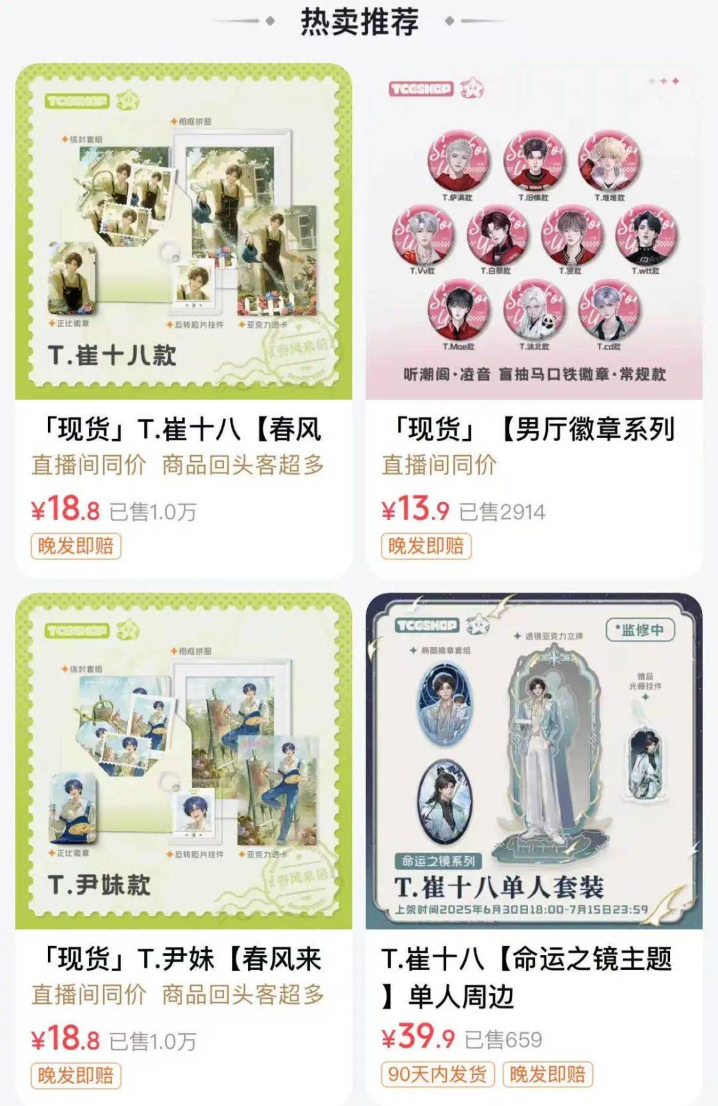 主播的人气、流水与周边的售卖数量紧密挂钩。头部主播T.尹妹是今年听潮阁公会赛“一竞到底”流水的TOP1,其“春风来信”单人周边销售量就达到1w+。与他销量相当的还有开线下见面会,上过《天赐的声音》的头部主播T.崔十八。