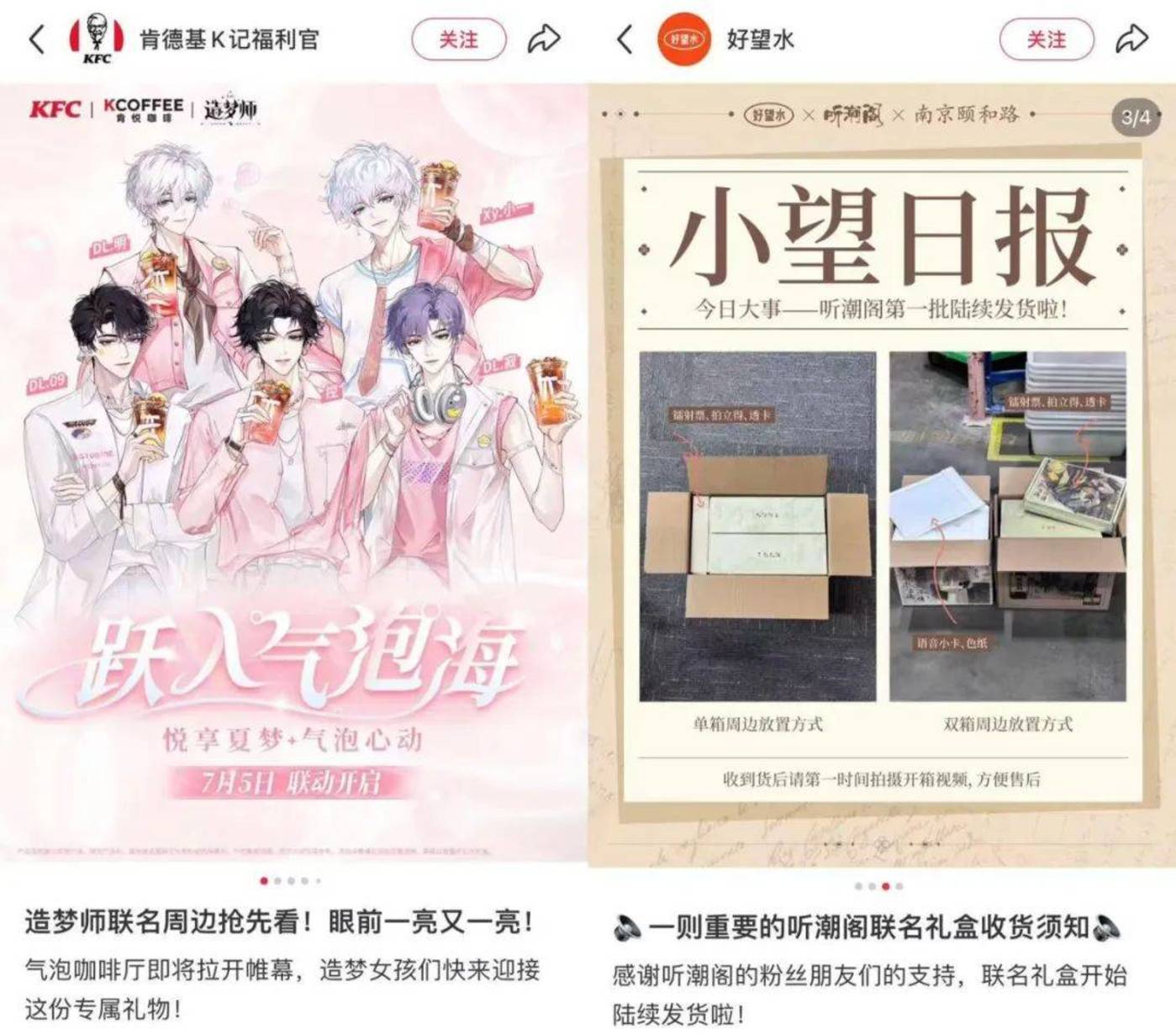 除了周边售卖外,语音厅正在依靠公会的IP与品牌联名。头部公会造梦师在最近就与肯悦咖啡联名了一系列套餐,玩法包含联名中最常见的购买套餐送周边,以及线下主题店打卡体验等方式。今年6月,听潮阁也与饮料品牌好望水做了一波产品与周边的联名,根据不同主播做了不同的产品与周边机制。