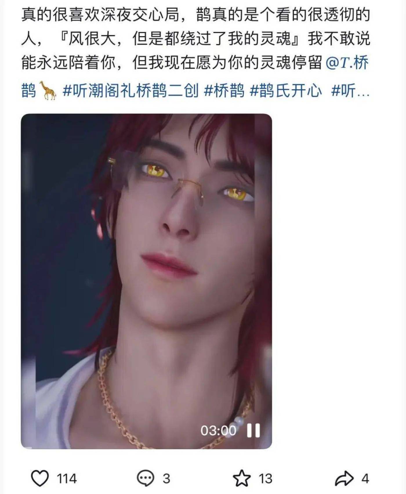 于恬就是在这次线下见面活动中成为了T.桥鹊的死忠粉,她追星喜欢给爱豆拍图,桥鹊1米9的身高,匀称的身材成为了声音之外,让于恬入坑的另一个点,“他就是很有男友气质,吸梦女,也很好拍。”