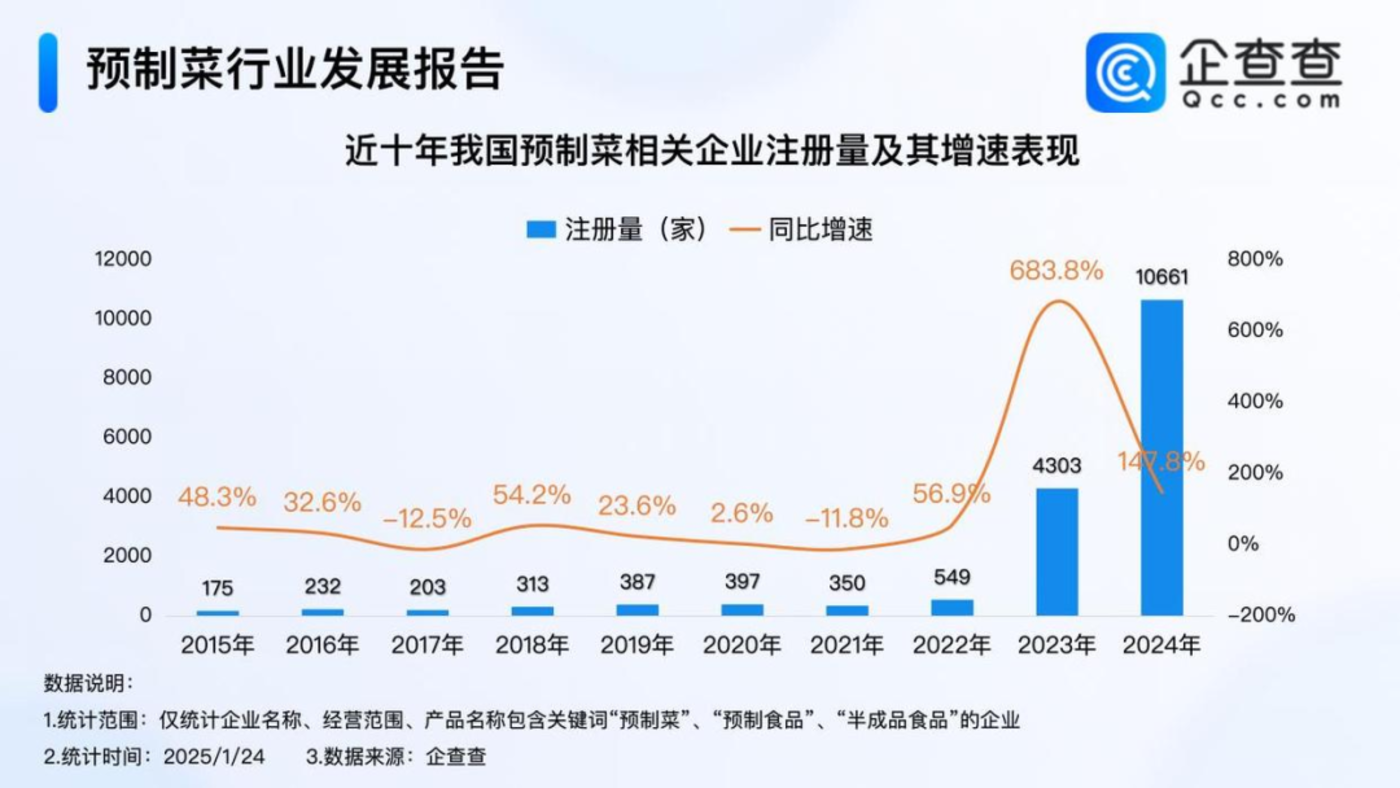 企查查数据显示,2023年,预制菜首次写入中央一号文件,预制菜相关企业全年注册量激增至4303家,达近十年预制菜相关企业注册量增速峰值;2024年我国预制菜相关企业注册量首次破万家,全年注册量同比增加147.8%至10661家,创近十年注册量新高。