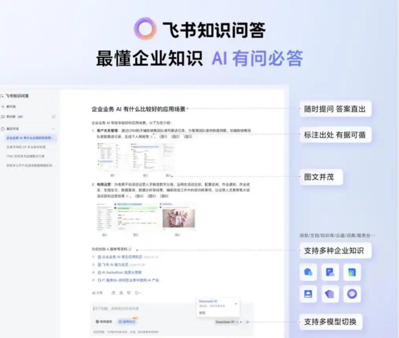 全新AI产品飞书知识问答的上线,更是佐证了这一点。作为一款基于企业知识的专属AI问答工具,飞书知识问答不再需要切换页面使用,而是直接融入飞书的应用侧边栏,与现有产品功能全面耦合。