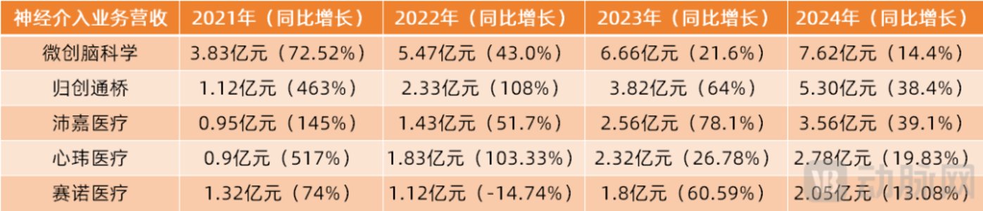 2021-2024年,神经介入头部企业营收增速极快。例如,归创通桥神经介入业务营收分别同比增长463%、108%、64%、38.4%;沛嘉医疗神经介入业务分别同比增长145%、51.7%、78.1%、39.1%……尽管各企业每年的增速有所波动,但整体维持较高水平,展现出行业头部企业在这几年同比增速较高的态势。
