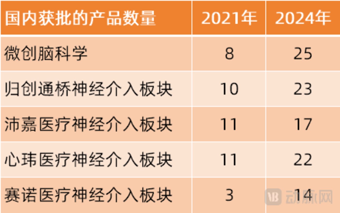 到了2024年,各头部企业获批并商业化的神经介入产品数量大幅增长。如微创脑科学有25款神经介入产品在中国获批并实现商业化,归创通桥为23款,沛嘉医疗为17款,心玮医疗为22款,赛诺医疗为14款。