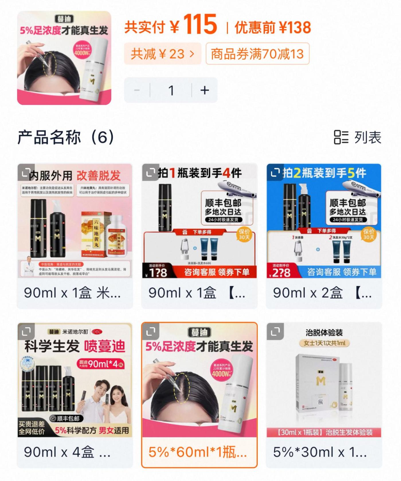 米诺地尔的大爆发,使得电商平台上涌现出大量廉价米诺地尔搽剂,售价约合28元左右。但同时,一些平台也涌现出缺乏国药准字号的超低价型“米诺地尔”,以假货鱼目混珠“割韭菜”。