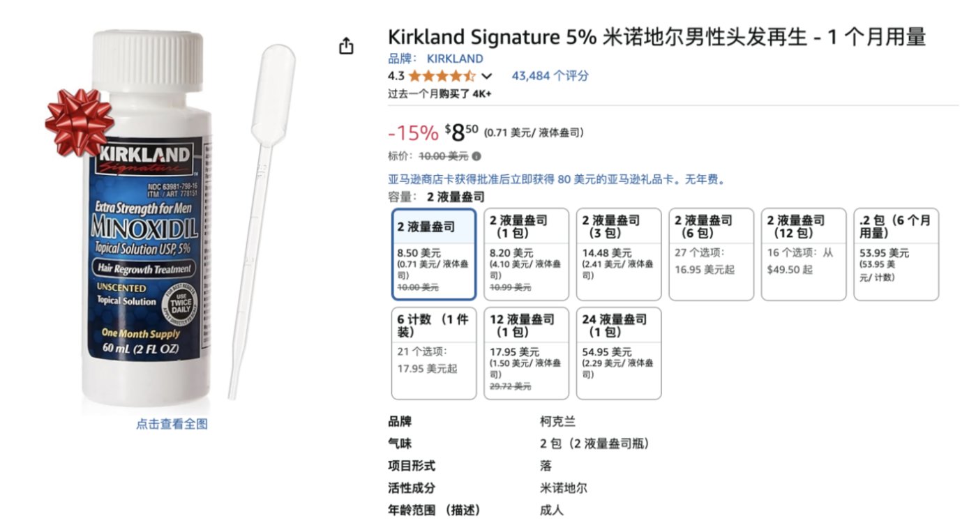 虽然落健等高端品牌在国外也保持着高昂售价,但在亚马逊平台上搜索米诺地尔,60ml5%浓度的普通米诺地尔售价仅8.5美元,按照汇率,约合人民币60元左右。