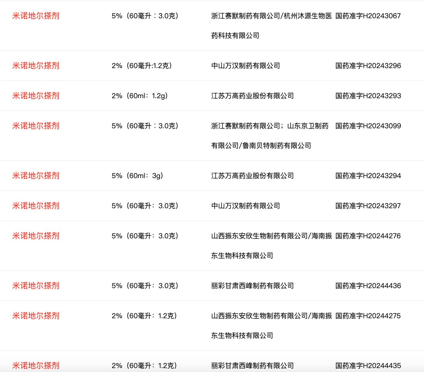 在2024年之前,获得国药准字认证的米诺地尔产品仅见于下表。