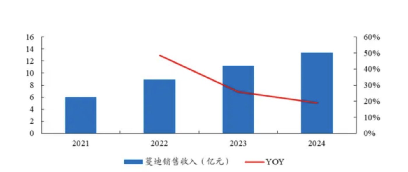 与植发行业不景气相反的是治疗脱发的药物米诺地尔的火爆。以米诺地尔龙头产品蔓迪为例,2024年,蔓迪销售收入13.37亿元,同比增长约18.9%。而2021年-2023年,蔓迪的销售额增速分别为63.7%、48.1%、25.8%。