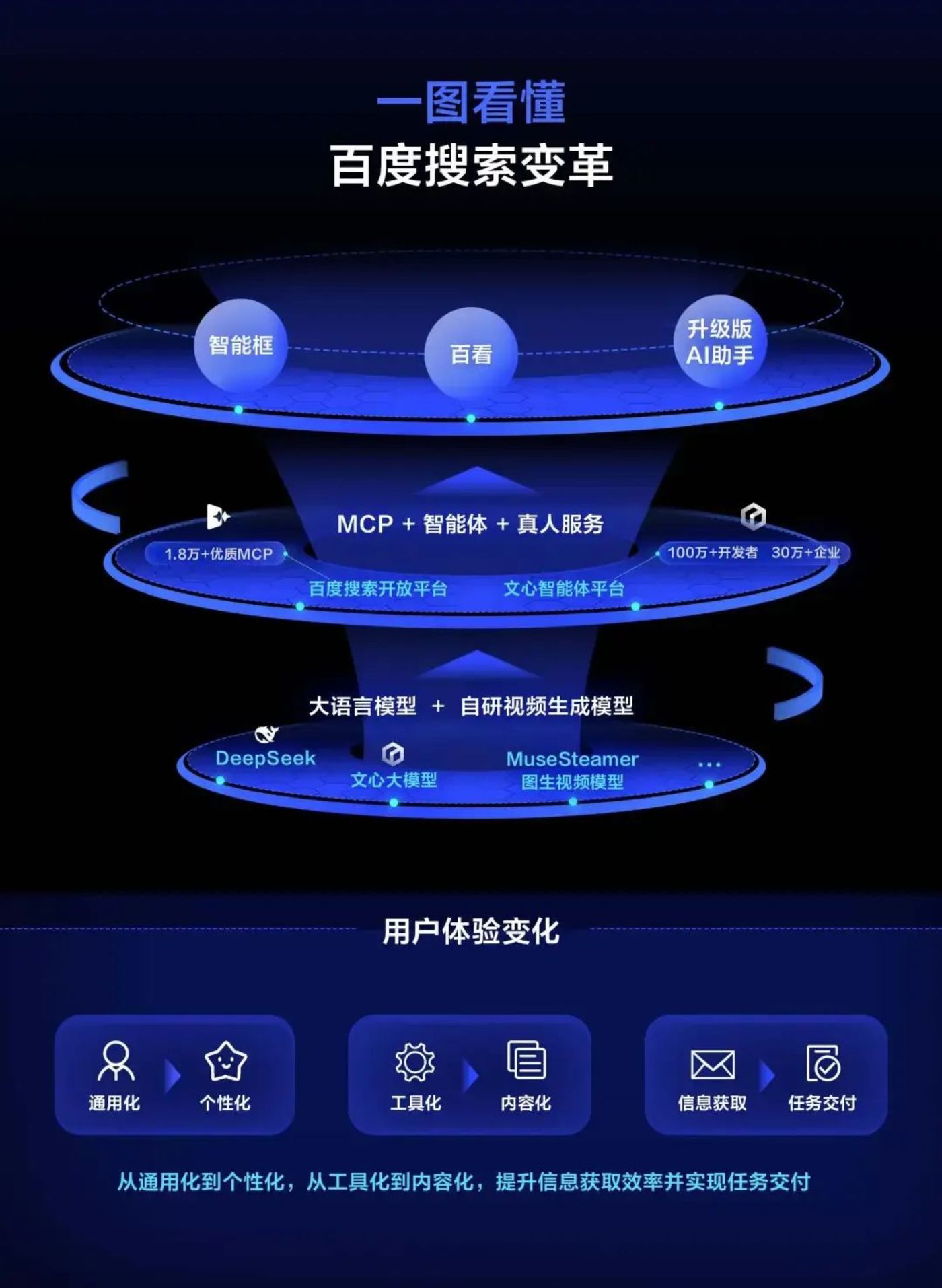 第四,对百度搜索的再定位。百度将新版搜索系统划分为三层架构:底层是多模态模型底座(以文心一言为核心,同时整合自研视频生成模型Muse Steamer与DeepSeek等外部模型);中间层是MCP调度平台、Agent工具和真人服务;最上层是面向C端的“智能框”、信息流产品“百看”和升级版AI助手。