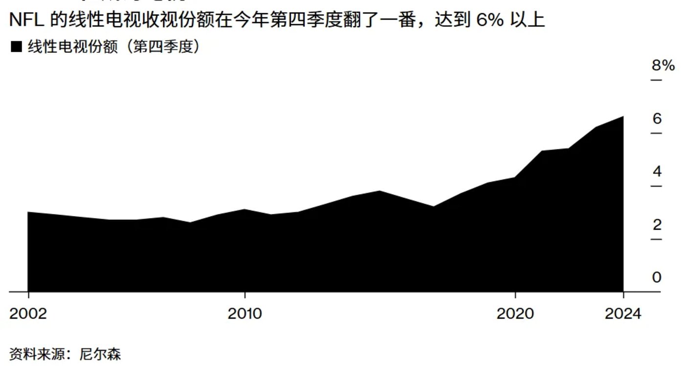 彭博社的分析称,虽然传统电视上其他所有内容的收视率都直线下降,但 NFL 不知何故变得更大了。上个赛季,职业橄榄球比赛平均吸引了超过 1700 万观众。这比一年前略有下降,但高于前几个赛季,与联盟在 2015 年创下的 1810 万的历史纪录相差不远。