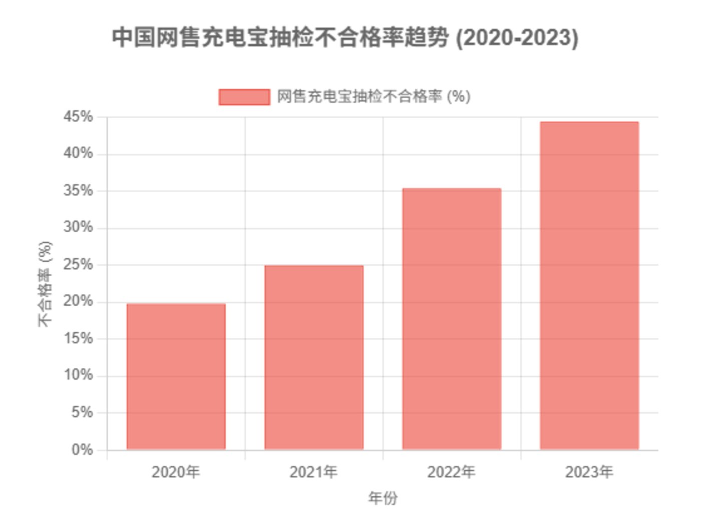 在这种极致的低价内卷下,产业链上的各个环节都面临着巨大的成本压力。为了生存和利润,部分厂商选择在消费者看不见的“安全成本”上动手脚,采购廉价电芯、默许供应商使用次级材料,便成了心照不宣的“潜规则”。这一系统性风险的恶果,在数据上得到了惊人的印证。根据国家市场监督管理总局的历年抽检数据,网售充电宝的不合格率从2020年的19.8%一路飙升,到2023年已达到惊人的44.4%。这清晰地表明,此次大规模召回并非孤例,而是行业长期“劣币驱逐良币”的恶果集中爆发。