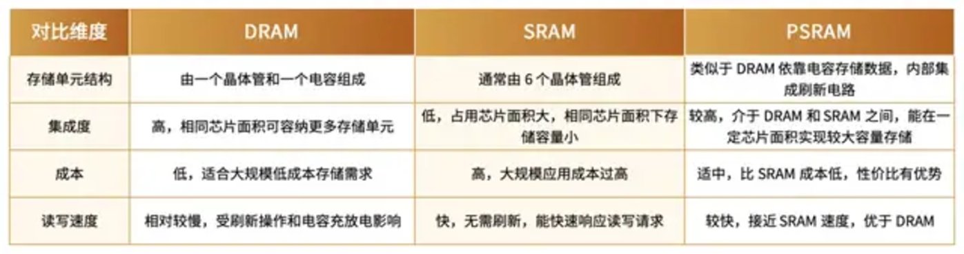 要理解PSRAM的优势,我们需要先了解传统存储器的特点。SRAM虽然速度快、接口简单,但因为需要六个晶体管来存储一个比特的数据,成本高昂且密度较低。DRAM虽然密度高、成本低,但需要复杂的控制器进行周期性刷新,增加了系统复杂度。PSRAM则巧妙地结合了两者的优点:采用类似DRAM的一个晶体管加一个电容的存储结构,同时保持了类似SRAM的简单接口。