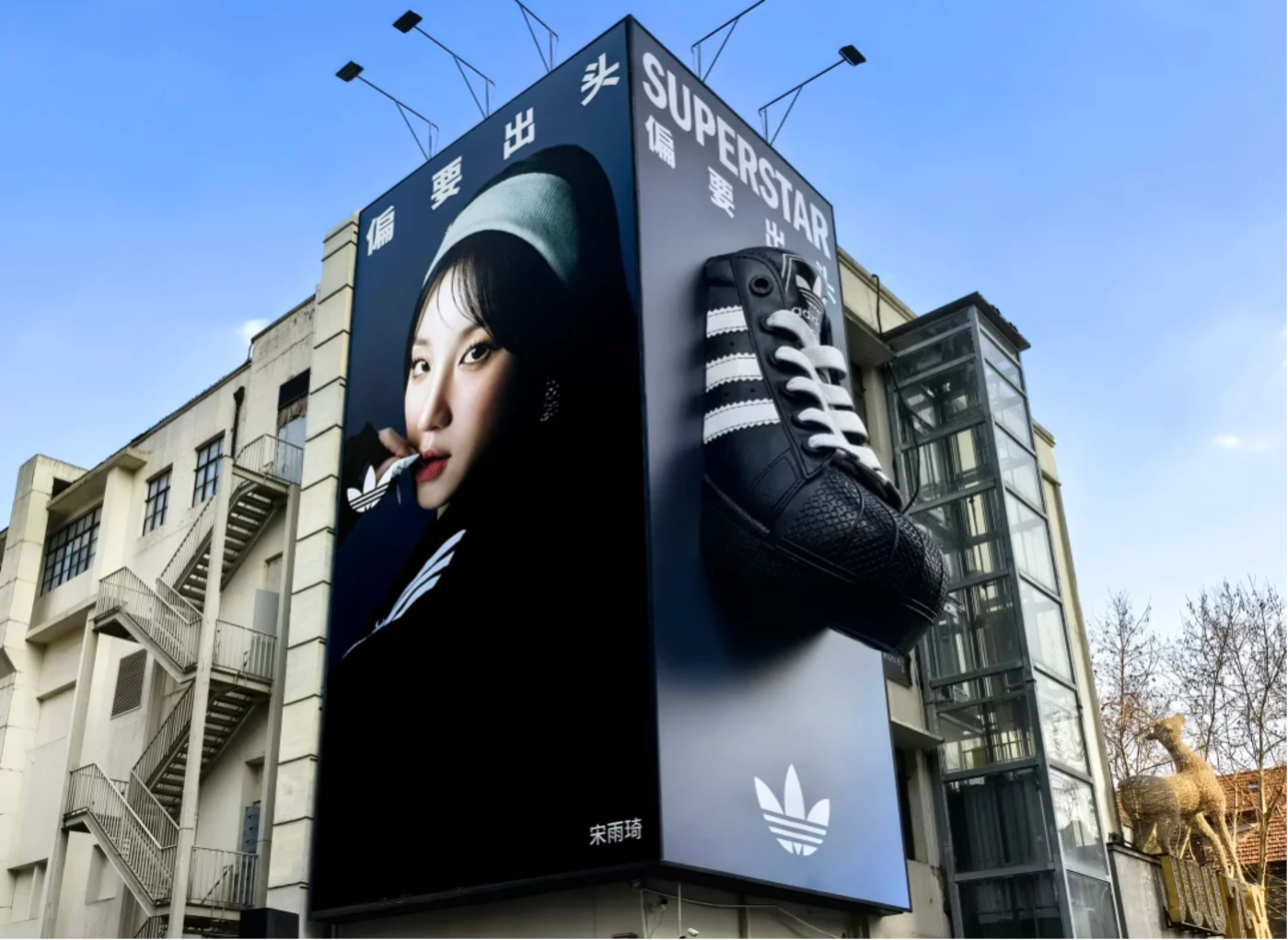 阿迪达斯对立体广告的使用向来超前,2024年,阿迪达斯就在三里屯的巨型艺术装置中放置了500件经典彩色复古版型外套,凭借巧妙的色彩搭配狠狠刷了一波存在感。今年3月,阿迪达斯又玩起了立体营销,将一只经典贝壳鞋的鞋头嵌入墙内,上方“偏要出头”的广告文案,既与凸出的鞋头完美呼应,又传达了品牌的态度和价值观,用心可谓非常巧妙。此外,阿迪达斯还在上海永源路带来“贝壳头街区”活动,以无数巨型鞋盒拼接出“贝壳头大楼”的外观,成为网友们争相打卡的网红景点,获得了非常不错的传播效果。