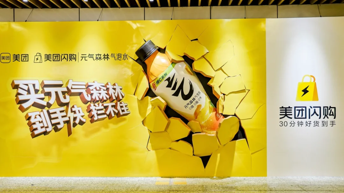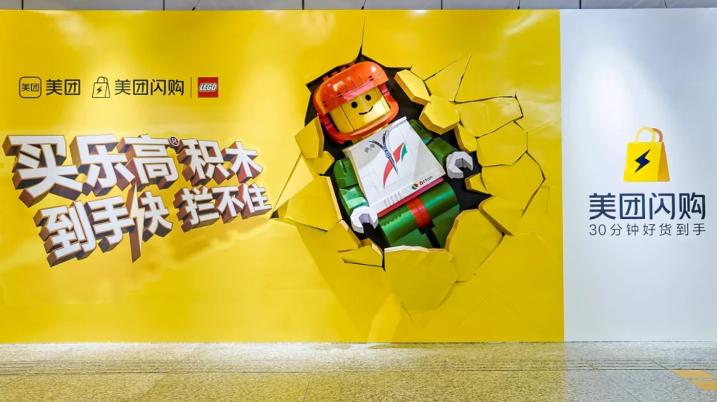 今年4月,美团闪购也在上海徐家汇地铁站投放了一组吸睛3D立体广告,乐高、元气森林、趣多多、罗森等经典产品被放大,搭配被“挤爆”的墙面,极具冲击力地体现了美团闪购“到手快 拦不住”的品牌主张,巨物营销+立体营销,在吸引路人注意力上,绝对算得上是“王炸”组合。