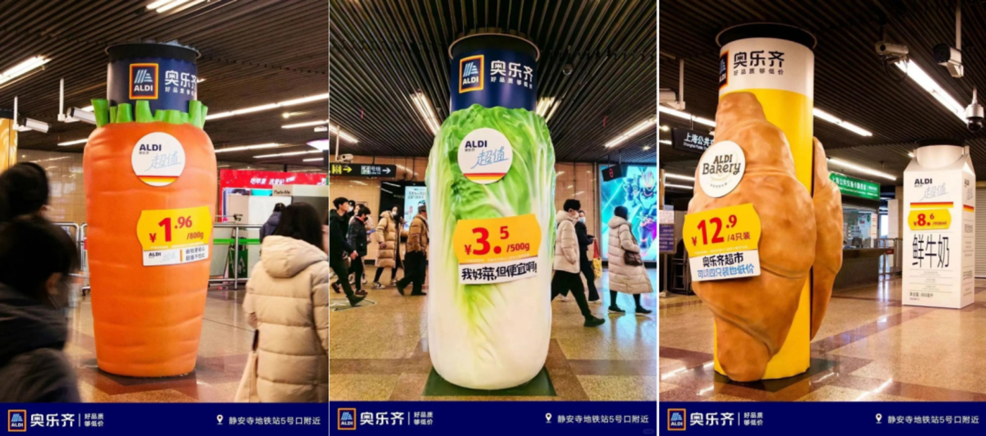 同样是在地铁立柱上做文章,奥乐齐用立体广告玩起了“菜市场文学”。2024年年初,奥乐齐在上海地铁站的立体广告引发了大量关注,奥乐齐将各种低价商品,如蔬菜、面包、牛奶等做成巨型装置,陈列在了地铁的立柱上,仿佛将路人拉进了超市现场,大而显目的价格标签直观清晰地体现出了产品的物美价廉,被网友们评价为“简单直接高效”,将平价超市的标签植入了路人的心智中。
