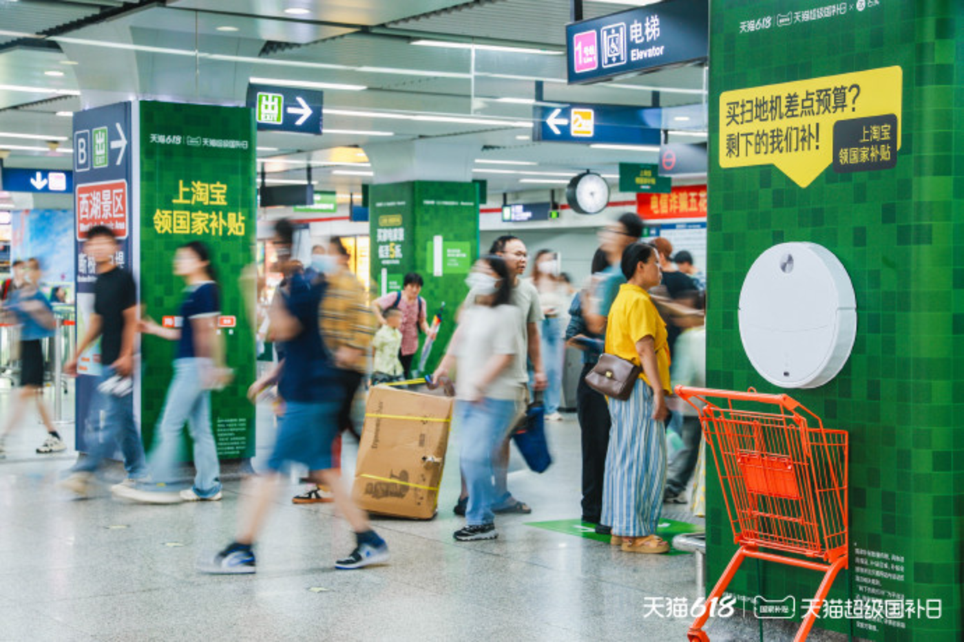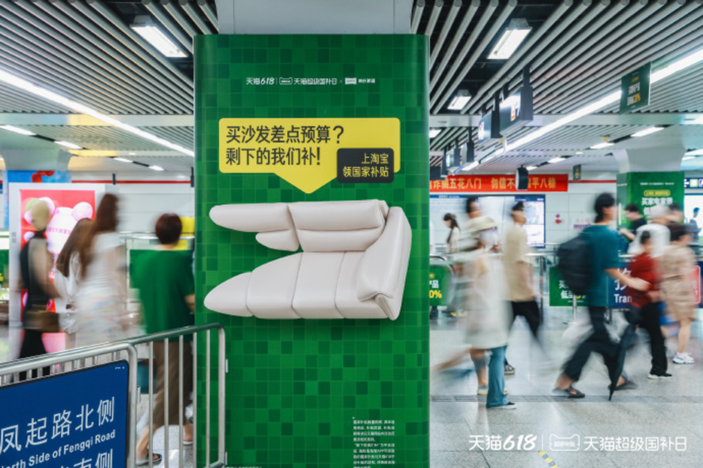 今年618,天猫联合小米、海尔、华为、美的、格力等20+品牌,在杭州凤起路地铁站打造了超级国补1/5站台立体广告,手机、洗衣机、电脑、花洒、棉被等用品部分嵌入墙里,部分破墙而出,形成了强烈的视觉冲击。更值得一提的是,利用1/5商品隐藏在墙里的立体装置,天猫将抽象的补贴政策具象化——上淘宝领国补,立省20%,用户只需要为墙外看得见的商品部分付费,这样的信息传达也是非常高效清晰了。