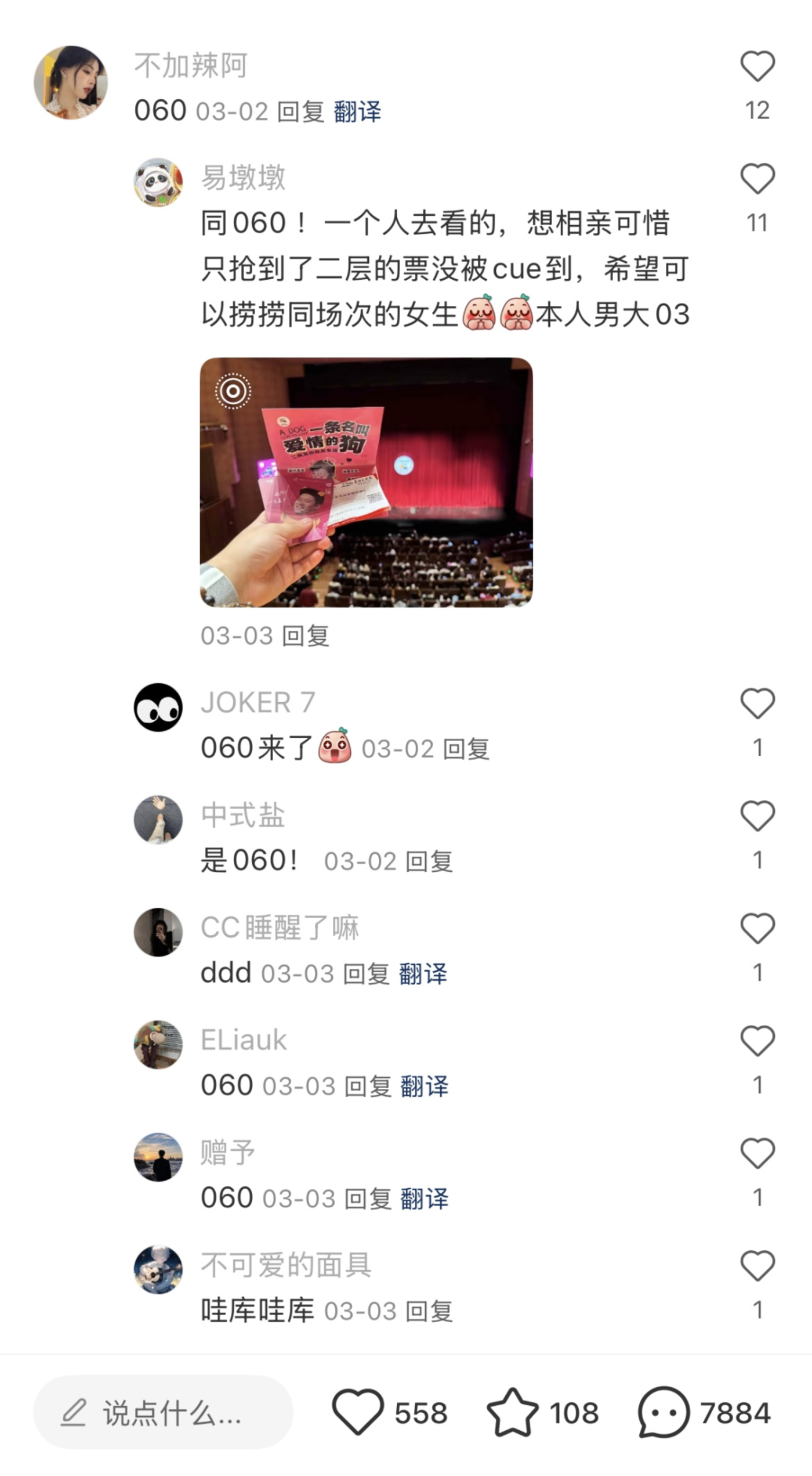 小红书有个置顶帖叫「狗窝集合」,现在很多演出是千人场,没互动到的粉丝就可以到「狗窝集合」的评论区填补遗憾。因为巡演的每一场我都有单独进行编号,比如说我昨天的是142场,粉丝们就可以在评论场次数字,留下资料聊天社交,将社交线下转化到线上。