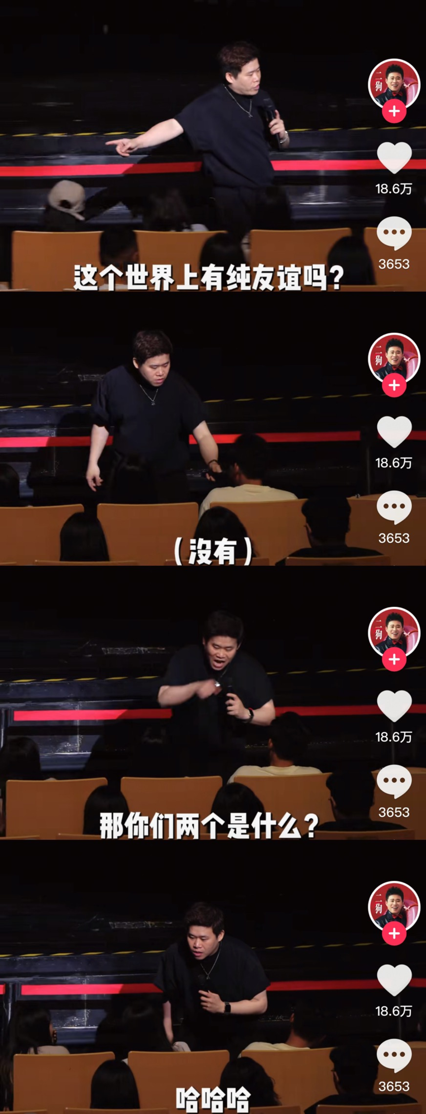 这是一支麦二狗的互动交友专场《一条名叫爱情的狗》现场,每次演出开始前,台下热切的观众都会兴奋喊出「不养闲人」的整齐口号。这并非有托或彩排引导,而是每一个主动来到二狗演出的观众,都早已在短视频切片中,一次次将这句话熟稔于心。