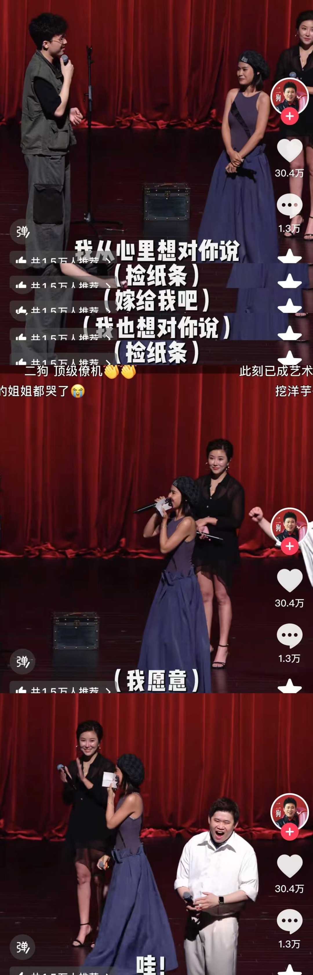 在捡纸条的时候,男生捡到的是「上天注定的最大」。因为15张纸条里面有好的有不好的,纯随机,第二张是好的概率很小。结果那个男生捡到的是「嫁给我吧」,那个女生也很感动,因为她捡到的是「我愿意」,全场就爆炸了。
