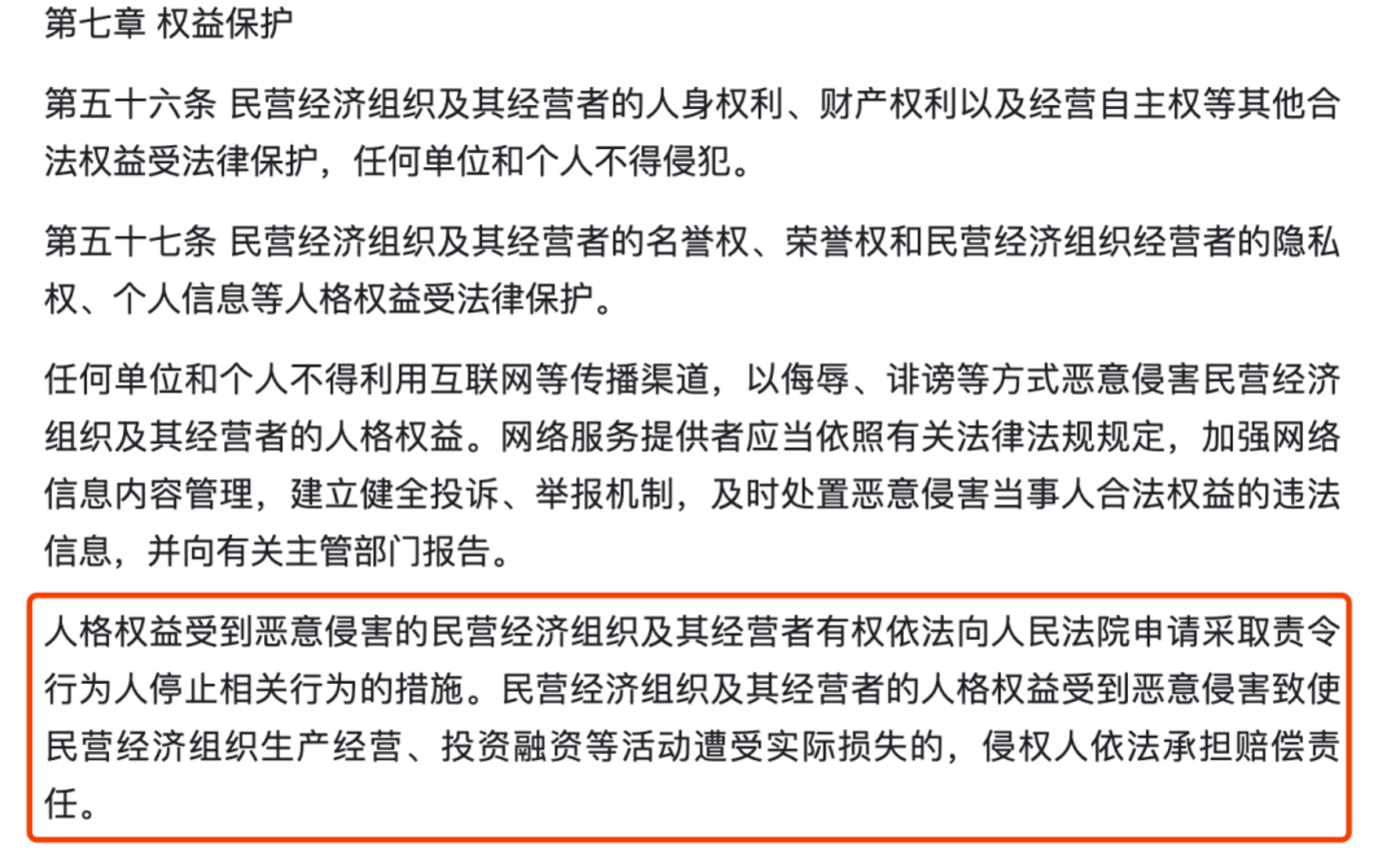 《民营经济促进法》征求意见稿第五十七条也提及,人格权益受到恶意侵害的民营经济组织及经营者有权依法向人民法院申请采取责令行为人停止相关行为的措施。民营经济组织及经营者的人格权益受到恶意侵害致使民营经济组织生产经营、投资融资等活动遭受实际损失的,侵权人衣服承担赔偿责任。