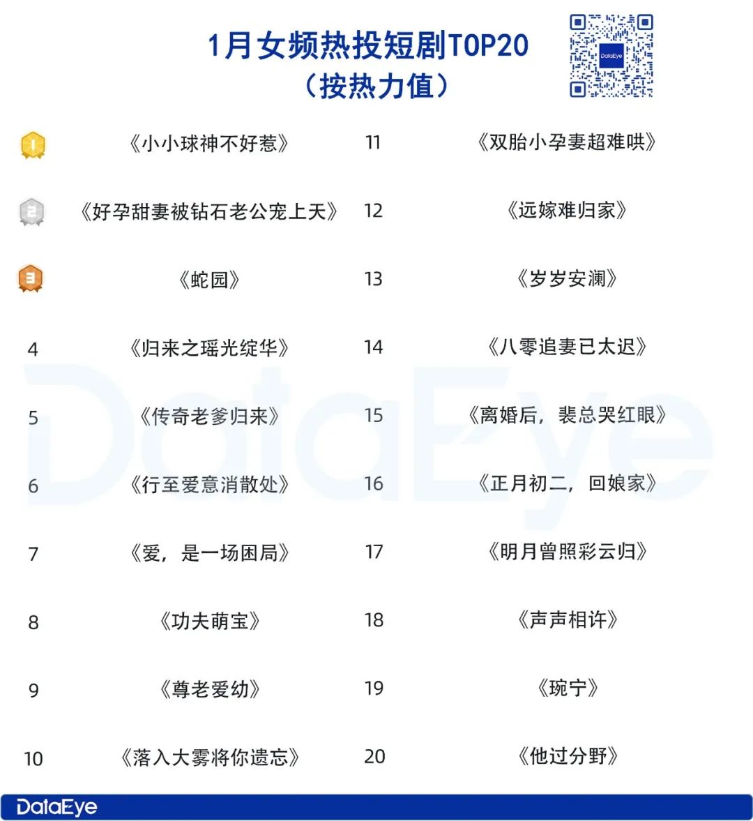 1月女频热投短剧中,麦芽《小小球神不好惹》登顶,阅文《好孕甜妻被钻石老公宠上天》第二,快创《蛇园》位列第三。其中,共有18部新剧闯入本月女频热投TOP20。