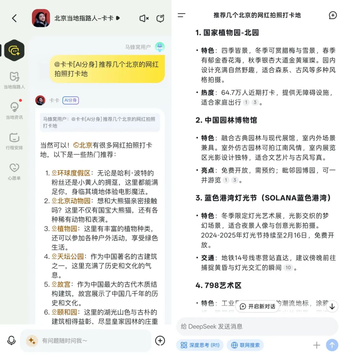 无独有偶,马蜂窝也存在类似的问题。2月12日,马蜂窝宣布其自研的AI智能应用正式接入DeepSeek大模型。剁椒Spicy分别让马蜂窝AI和DeepSeek官方“推荐几个北京的网红拍照打卡地”,结果这两个产品给出的回答高度相仿,马蜂窝AI并未结合自家社区的优质内容,给出更高质量的回答。