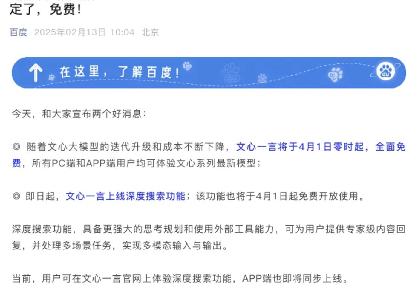 更有甚者,DeepSeek 还引发了巨头们的商业护城河崩坏。2月13日,百度官宣,文心一言将于4月1日零时起全面免费,所有PC端和App 端用户均可体验文心系列最新模型。无独有偶,OpenAI CEO萨姆·奥尔特曼也在社交媒体平台透露,未来ChatGPT免费用户将可以在标准智能水平下无限制访问GPT-5。