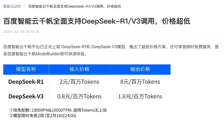 对比而言,DeepSeek-R1的官方价格为输入4元/M tokens,输出16元/M tokens,DeepSeek-V3的官方价格为输入2元/M tokens,输出8元/M tokens,均为百度智能云平台价格的数倍。