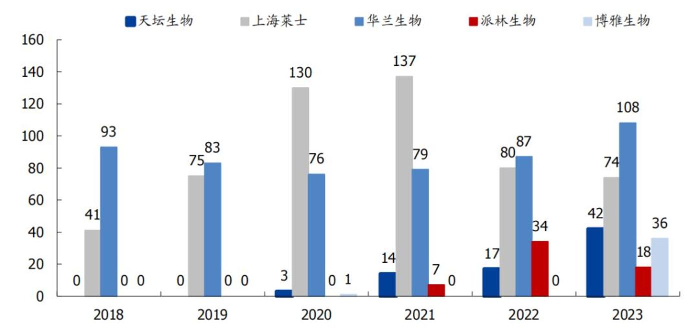 纵观血源类凝血因子格局,华兰生物与上海莱士是行业龙头,FVIII的批签发量始终处于领先地位。不过,随着天坛生物、派林生物、博雅生物的逐渐发力,各家几乎都拥有了血源类凝血因子的供给能力。