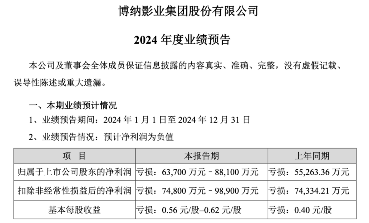 1月23日,博纳影业发布了2024年度业绩预告,预计归属上市公司股东净利润亏损6.37亿至8.81亿,扣除非经常性损益后的净利润亏损7.48亿至9.89亿,自2022年回归A股以来,博纳已经实现了连续三年归属上市公司股东净利润出现亏损。