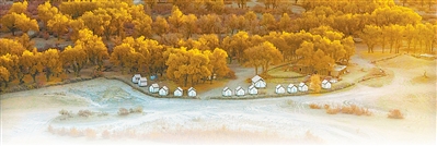 新疆于田县达里雅布依老村地处沙漠腹地,不通公路、没有通信信号和稳定供电。整村易地扶贫搬迁后,当地在老村附近发展沙漠探险等特种旅游,吸纳村民加入旅游合作社,拓宽增收渠道。图为老村附近的胡杨林带和新修的民宿。新华社记者 陈 朔摄