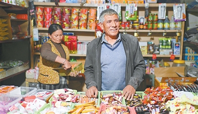 村民艾尼瓦尔·买提斯地克(右)和妻子一起在达里雅布依老村经营一家小商店,为到访的游客提供便利。新华社记者胡虎虎摄